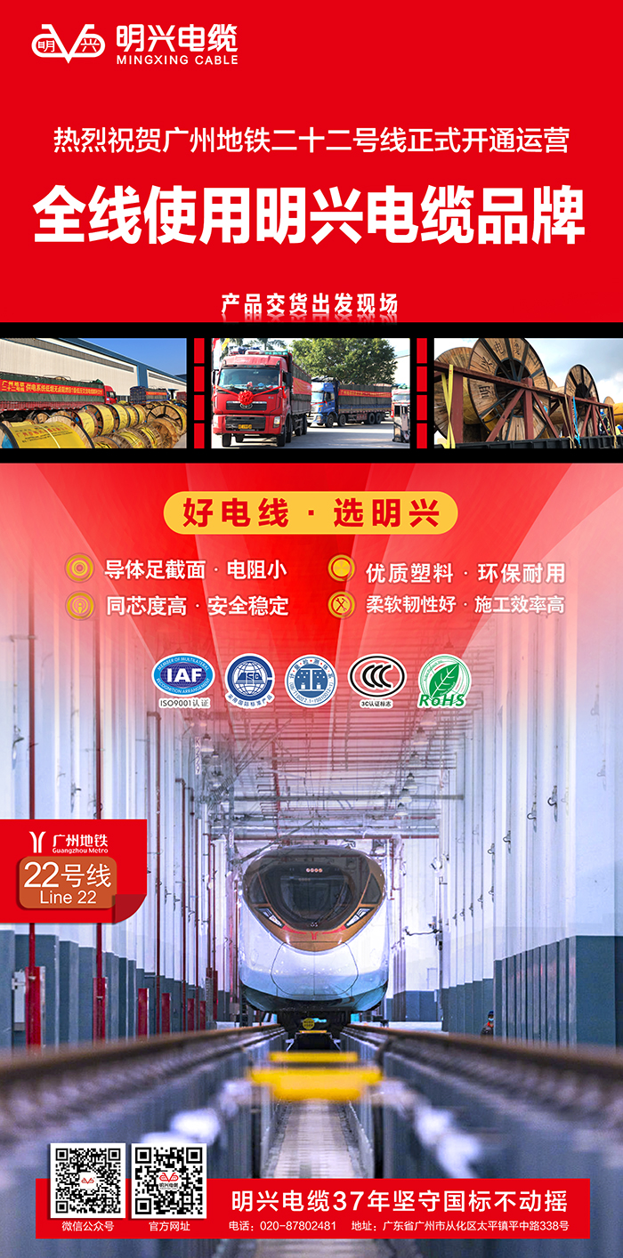 明興電纜優(yōu)質的產品和良好的口碑獲得了廣州地鐵公司的青睞與認可,成為二十二號線全線纜供應商,支持著城市軌道交通事業(yè)的發(fā)展,緩解城市交通壓力,助力人們更好地享受出行的生活。